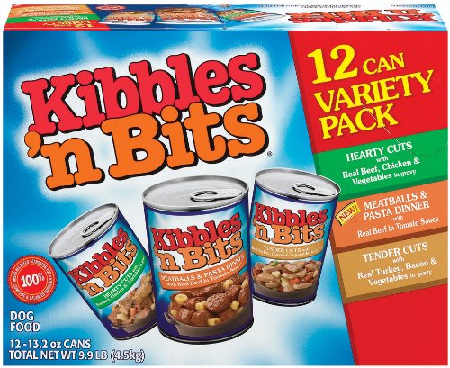 Kibbles 'n Bits Dog Food, 12 Can variety pack, 100% complete and balanced nutrition. Four hearty cuts with real beef, chicken and vegetables. Four meatballs and pasta dinner with real beef. Four tender cuts with real turkey, bacon and vegetables in gravy . Totally four cans of each flavor.